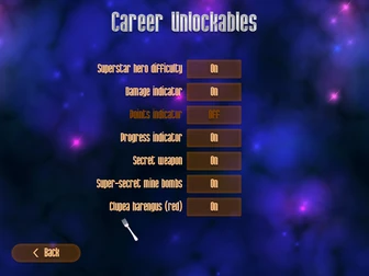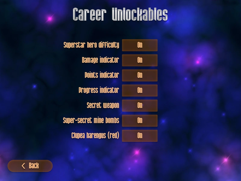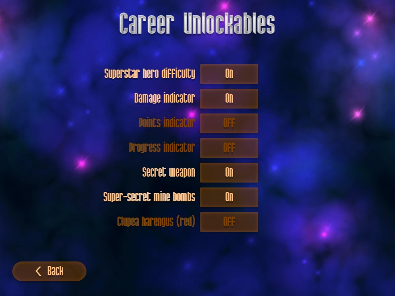 <p>Career Unlockables: Superstar Hero Difficulty Unlocked! Damage indicator Unlocked! Secret Weapon Unlocked! Super-secret mine bombs Unlocked! Points Indicator Unlocked! Progress Indicator Unlocked! Clupea Harenugus (red) Unlocked!.