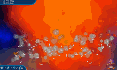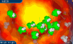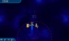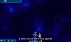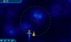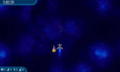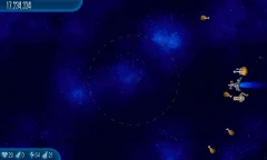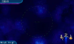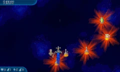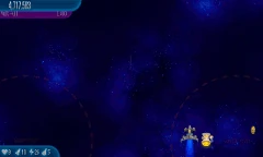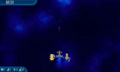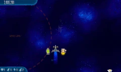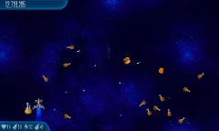 Satellite Stock 11 Chicks fly around the screen. They're surrounded by another circle of four Alien Containers and seven Chicks, which is surrounded by another circle of 11 Chicks that are connected by lasers. |