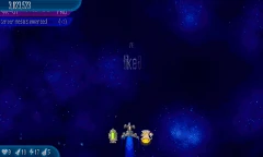 Chink in the Armor 3 Chicks, 3 Chickens, 3 Pilot Chickens, and 3 UFO Chickens fly around the screen. Most are protected by Bubbles, except for one Chick. Killing one enemy will remove a bubble from another one. |