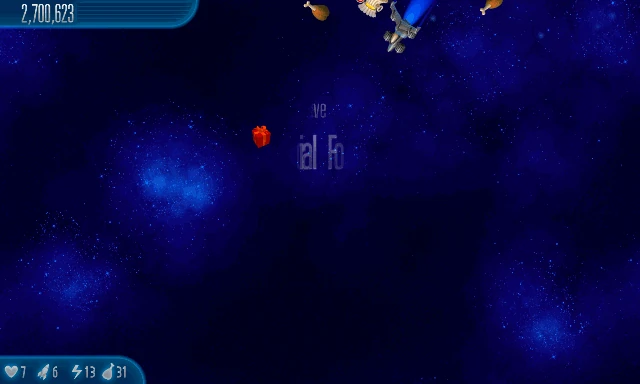 Two Squared Two Chickenauts arrive close to the sides of the screen, one to the left, and one to the right. They are surrounded by 40 Chicks. |