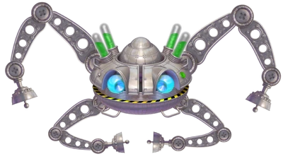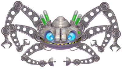 Appearance: It's an "improved" Space Crab. The last defeat was most likely devastating, which could explain why it's so different. The head part has one regular green "eye" and a red one with a different design, and four red liquid containers above it. Every time 20% of its health is depleted, one container gets destroyed. It also has four arms for throwing fireballs, which use a different design. Its metal parts are black with some green sprinkled on the top part of the head.
