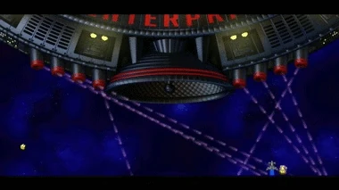 The Henterprise's entrance attack. It fires a huge laser from its main satellite dish. The sides of the beam are safe. |
