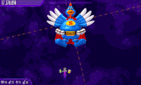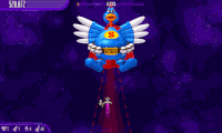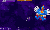The Super-Chick is encountered yet again at the end of the Return to the Milky Way chapter as part of the Chicken Multiplicity boss. It has 125000 health in this encounter, much more than the previous one. Its attack pattern has been heavily simplified, as it no longer is able to use Laser Beam, Bulk Eggs, and Guano Spray. Instead, it will constantly use Quadruple Laser until it dies. Once its health is depleted, it will explode, and give 200000 points, 10-12 Food items, and a Gift. Two Infini-Chicks will spawn in its place. It still has its weaknesses and strengths from the last encounter.