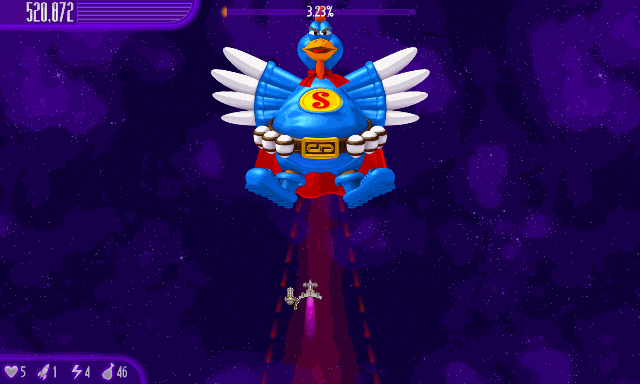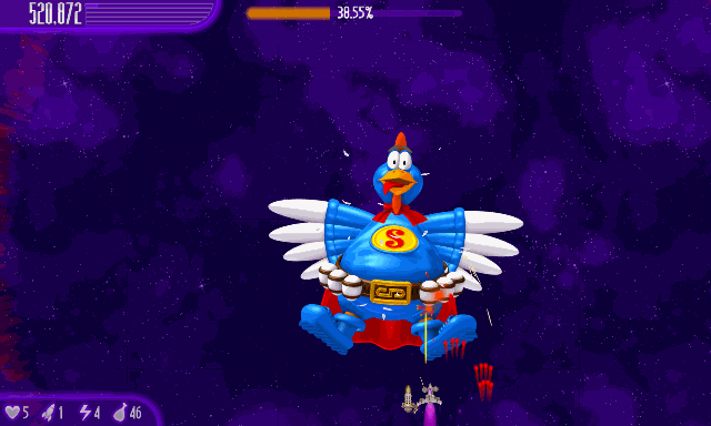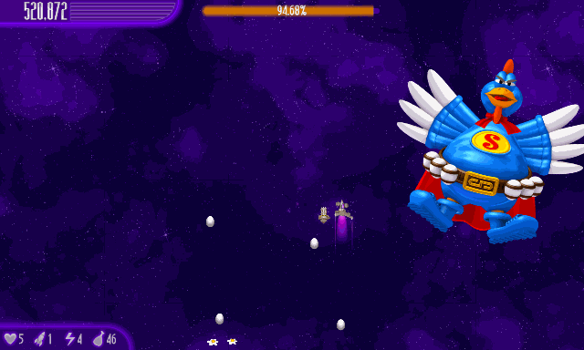 The Super-Chick is first encountered at the end of the In a Galaxy, Far, Far Away... chapter, after a fake Chickenaut boss. There, it has 60000 health. It starts off the fight with the Laser Beam attack, after which it will randomly choose either Laser Beam (again), Bulk Eggs, or Guano Spray. Once its health is depleted, it will explode, and give 25000 points, 10-12 Food items and a Gift. It's weak to Positron Stream and it's strong against Neutron Gun, Plasma Rifle, and Photon Swarm.