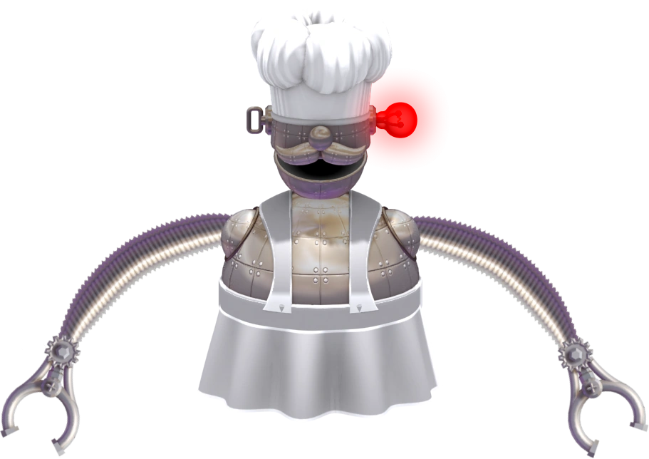 It's a robot chef, which wears a chef apron. The head part has a toque blanche on it, a metal handlebar mustache, a nose, and a mouth. A red diode sticks out of its head. It has two metal arms, which it uses to throw vegetables.
