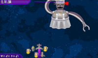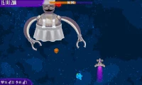 It is only encountered once at the end of the Space Burger Headquarters chapter. It has 200000 health and gives 25000 points and five Roasts upon defeat. It has a somewhat simple attack pattern - first, it uses Food Throw, in which it throws food at you six times. Then, it uses the same attack two times at once with both of its arms, three times. It finishes off the pattern by using Food Spread, which is a spread attack, in which it shoots 16 vegetables at once at different directions, equally spaced from each other. Every 10% of its health depleted, it will spawn a Gift. It's weak to the Bird-Flu Gun, even though it's not organic, and it's strong against Positron Stream.